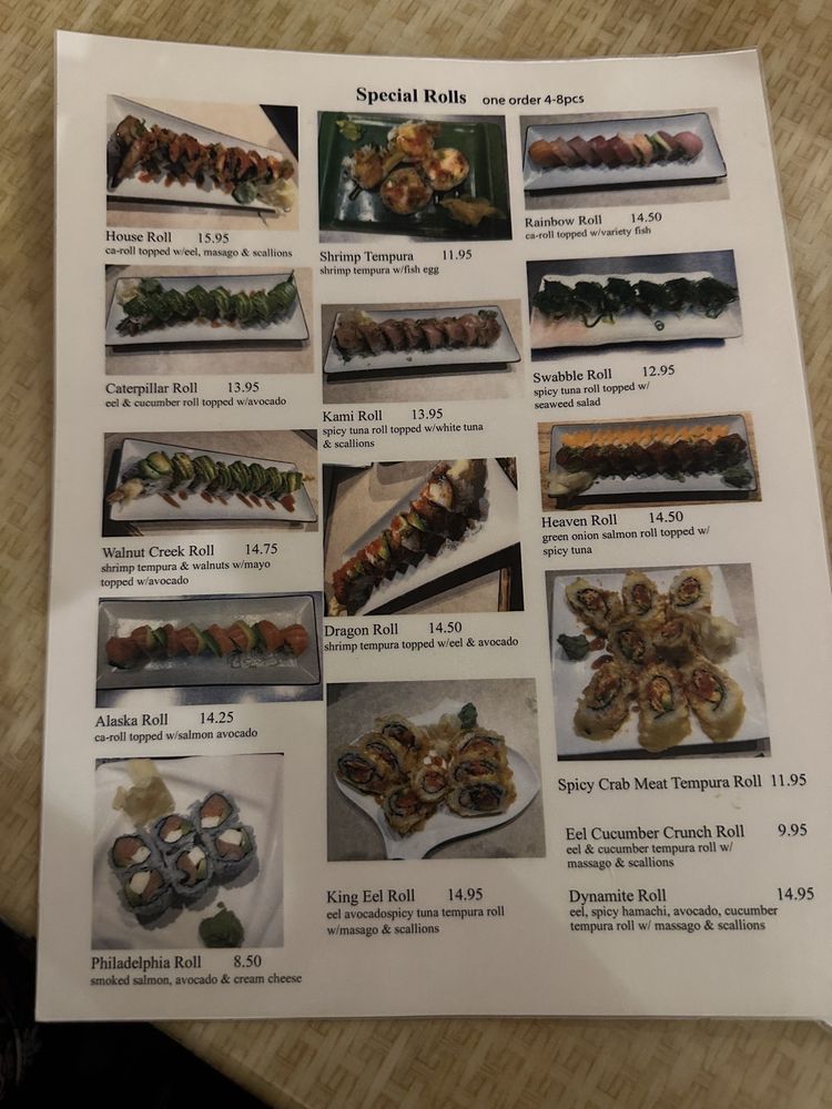 Shrimp tempura and imitation crab roll topped with hamachi, eel and tobiko.